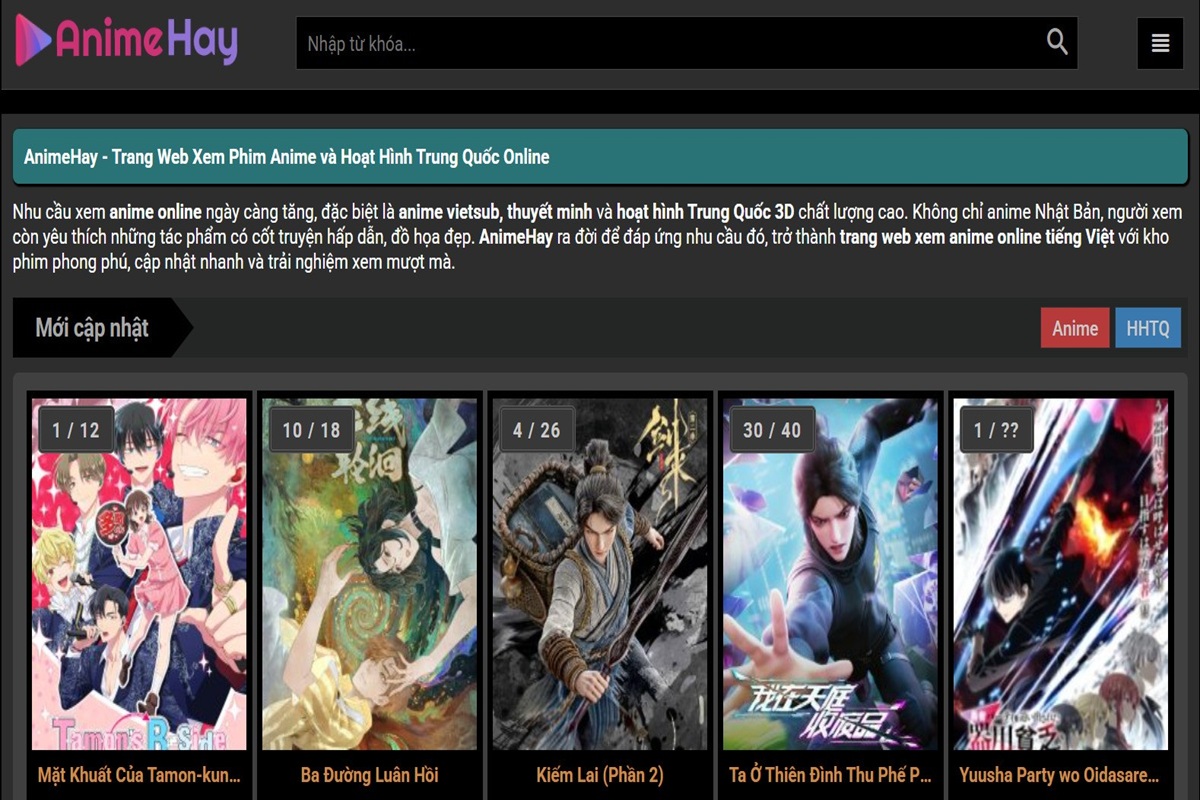 AnimeHay là web xem phim anime online tiếng Việt với kho anime vietsub và hoạt hình Trung Quốc 3D chất lượng Full HD. Cập nhật anime mới mỗi ngày, xem miễn phí.